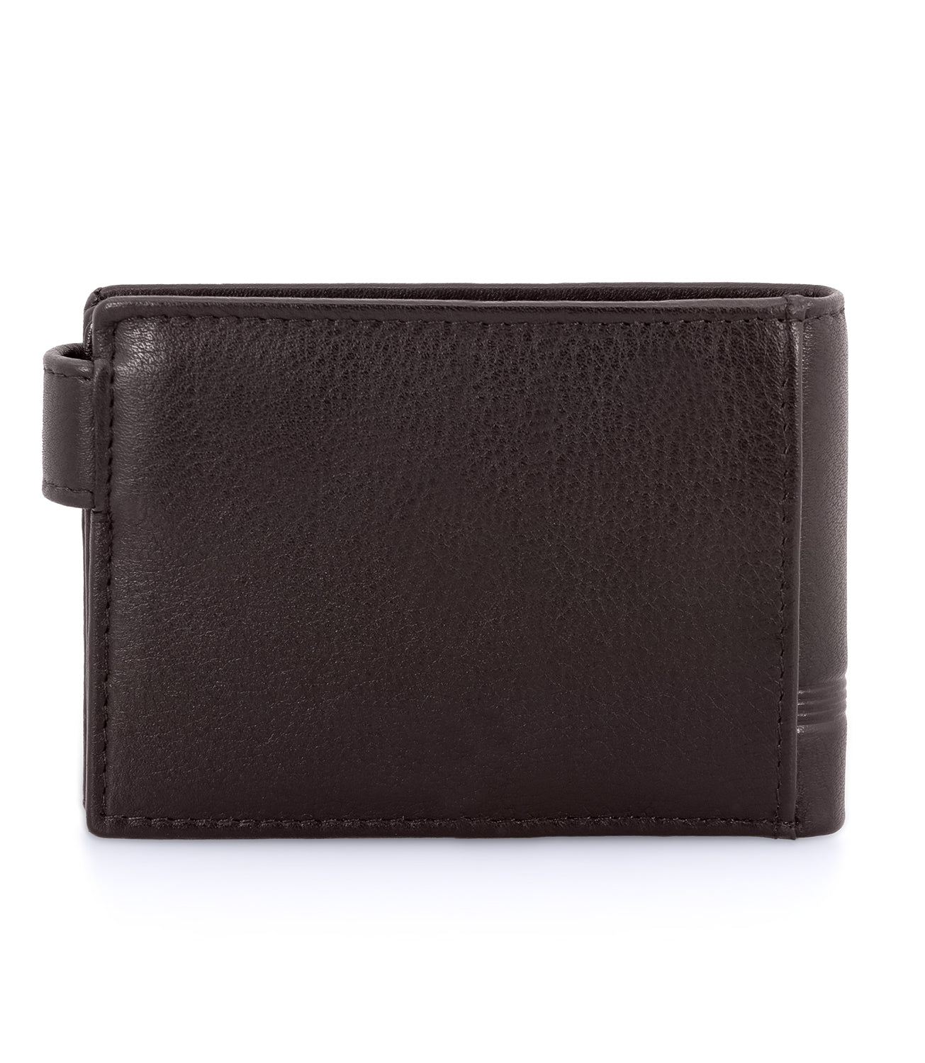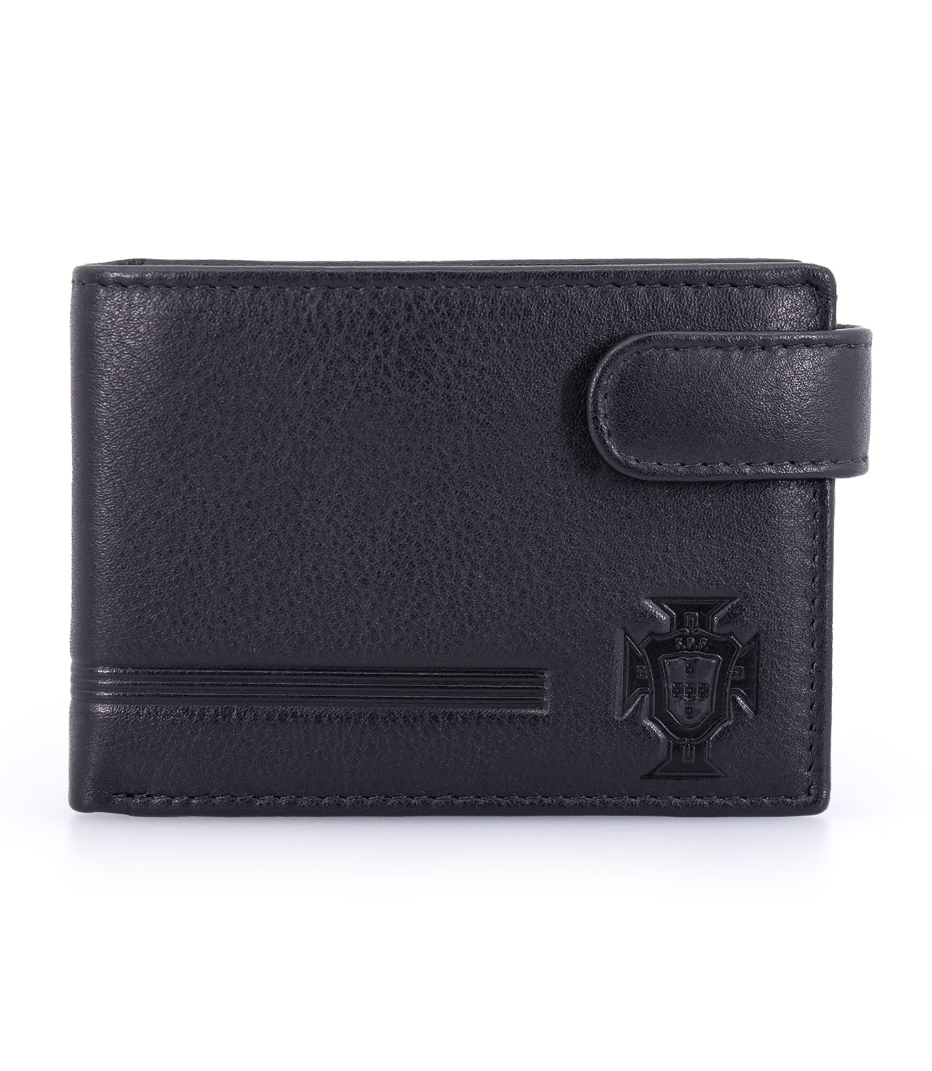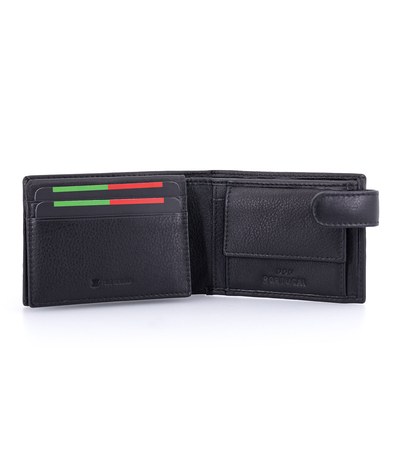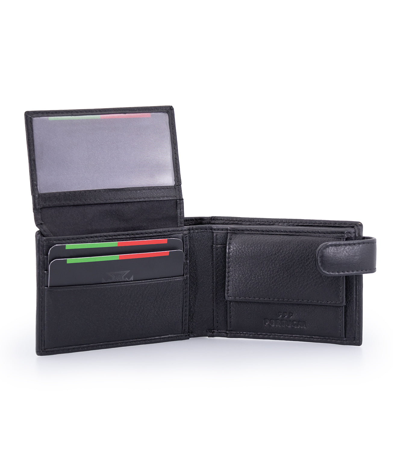 Ranhuras para cartões e uma aba com janela para documentos com foto. Porta-moedas com fecho de mola. Divisória para notas. Proteção RFID.