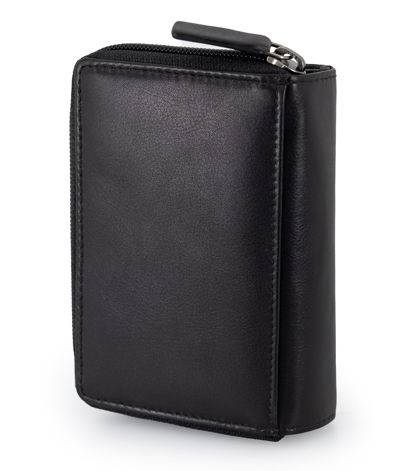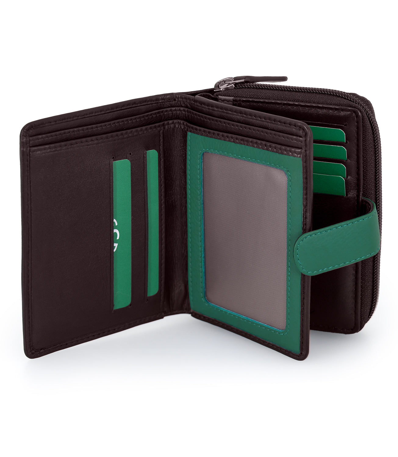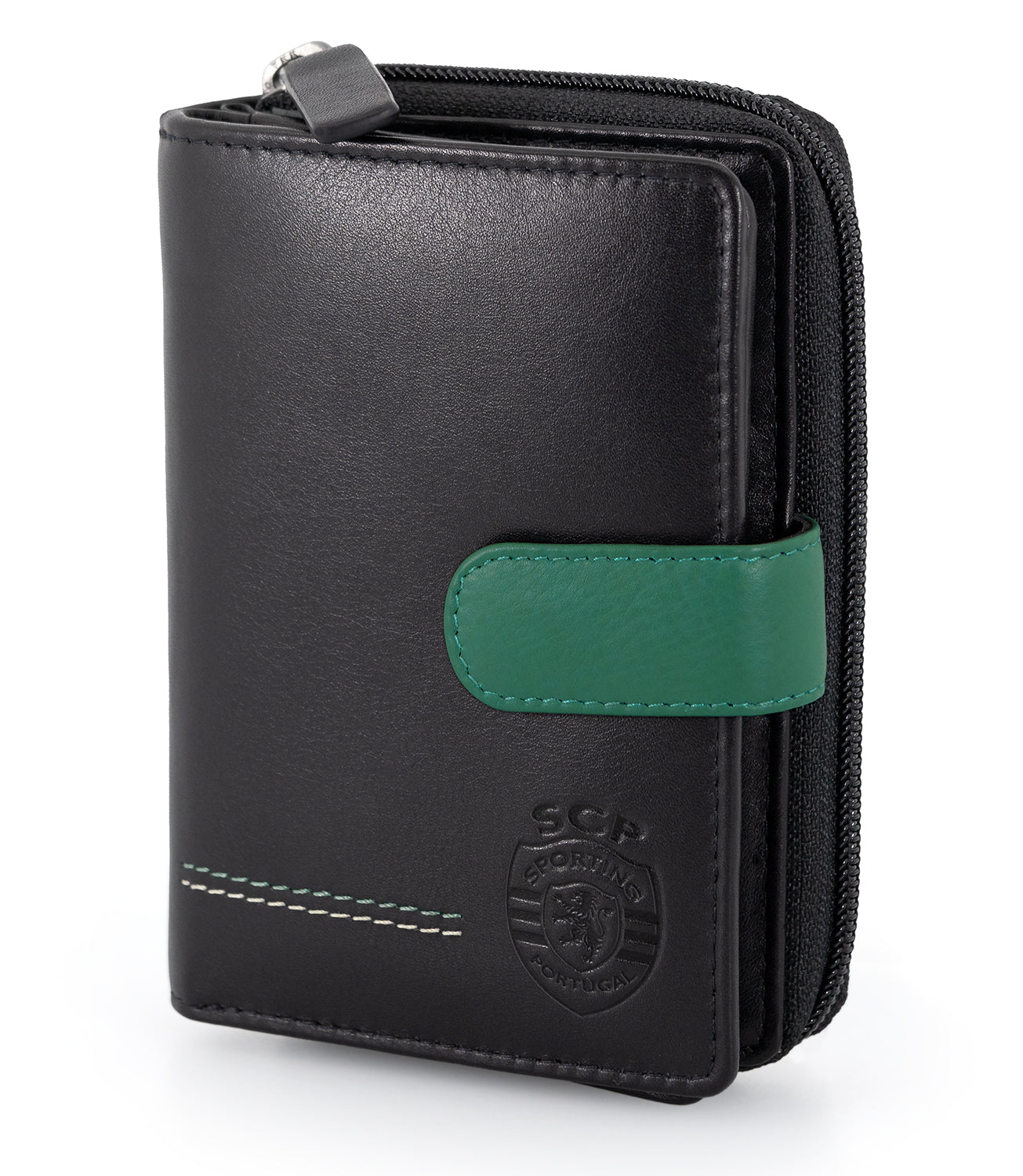 Carteira de Senhora Sporting em pele genuína com detalhe de pespontos verde e branco. Compartimentos para cartões, porta-moedas e documentos com fotografia. Proteção RFID.