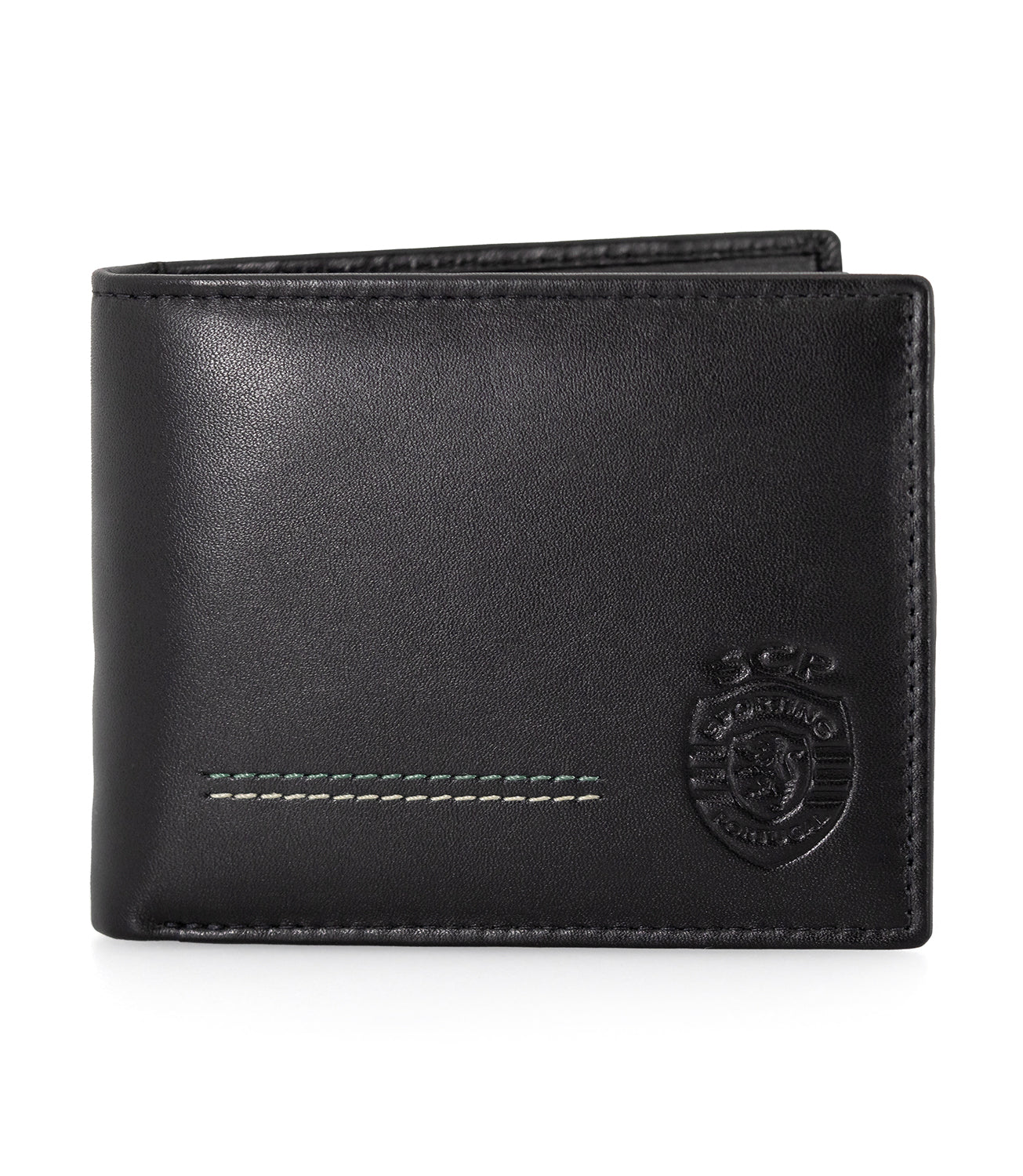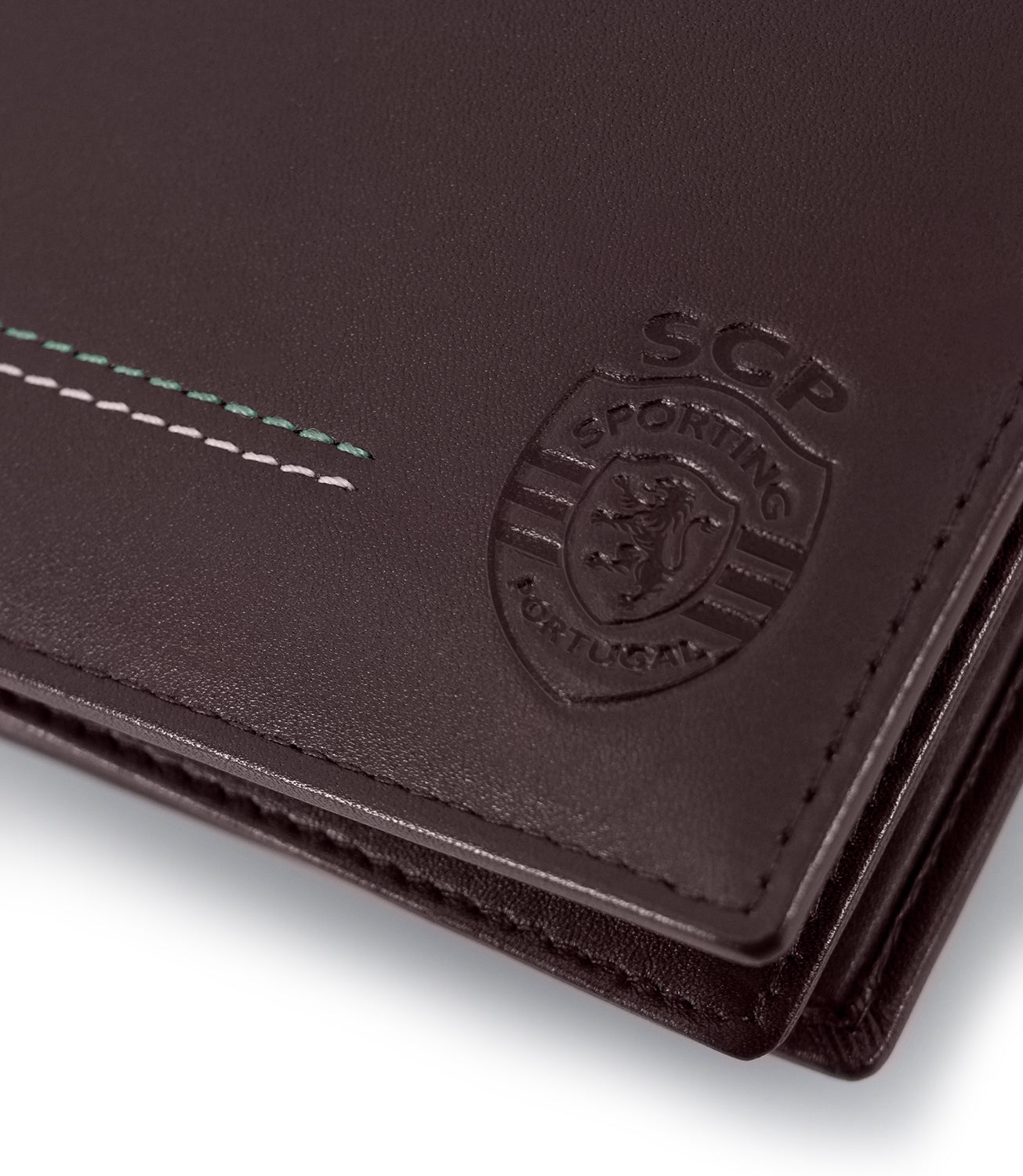 Carteira em pele genuína Sporting CP. Detalhe de pespontos em verde e branco.