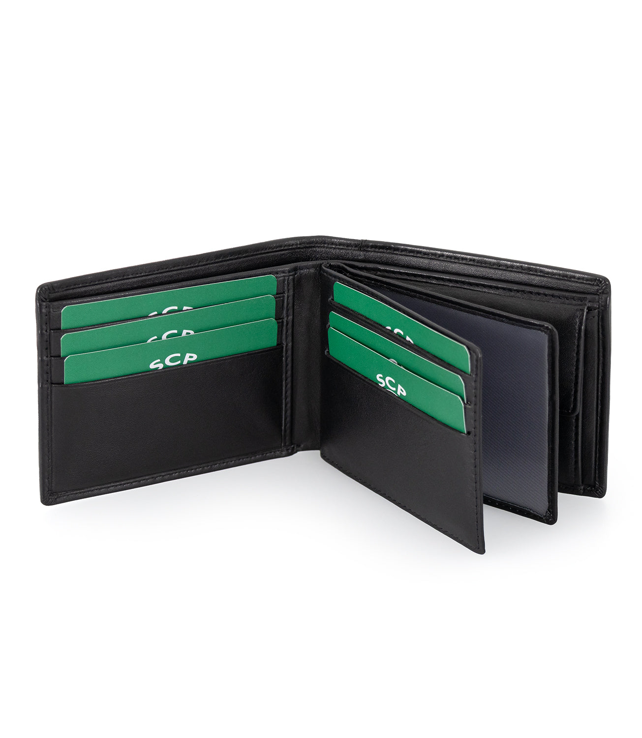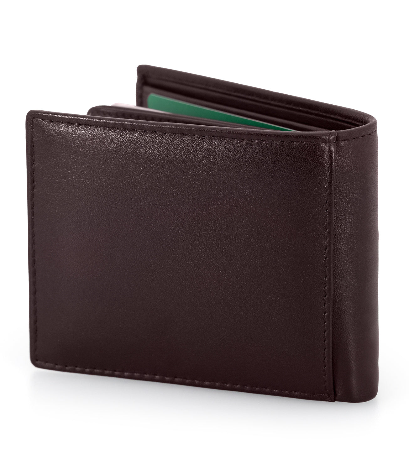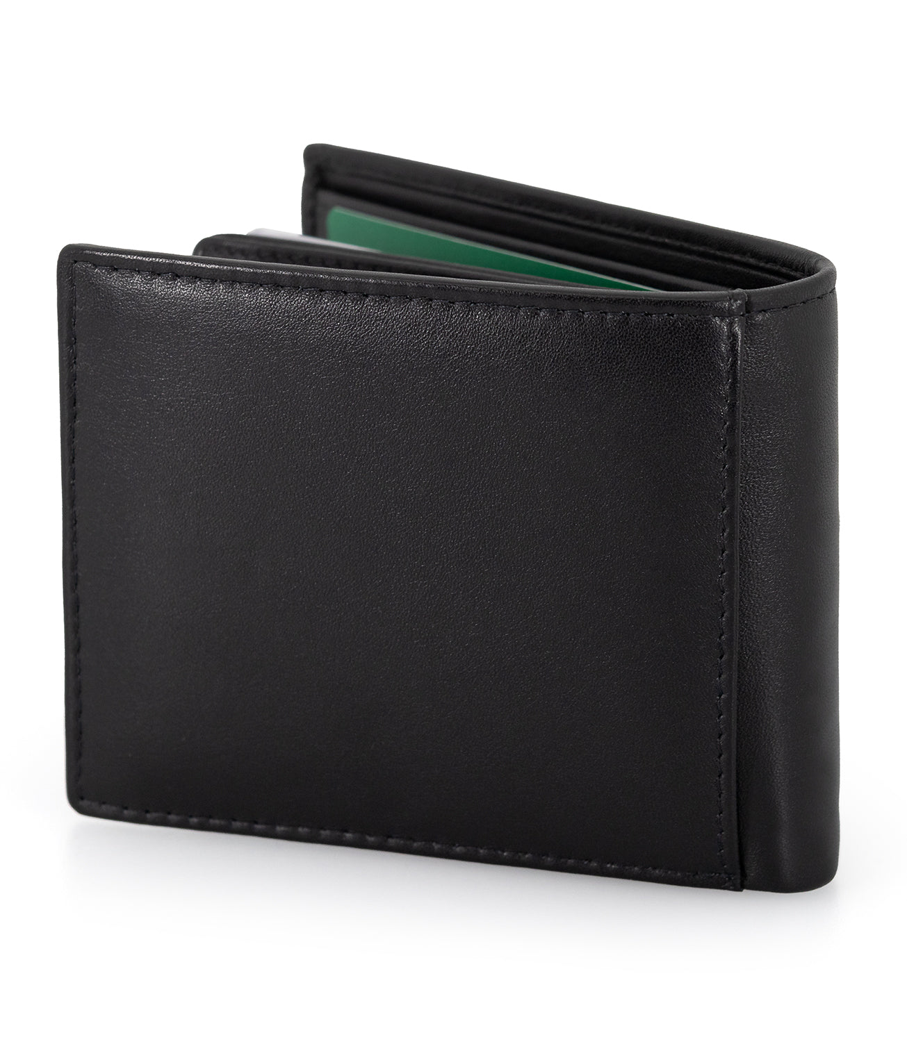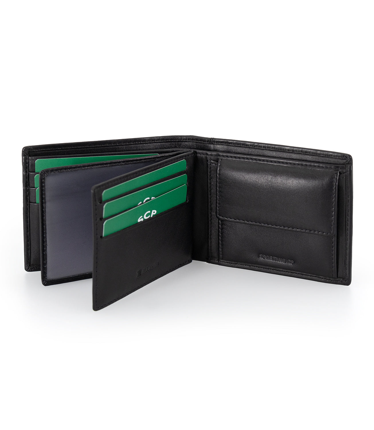 Com ranhuras para cartões e uma aba com janela para documento com foto. Porta-moedas com fecho de mola. Divisória dupla para notas. Proteção RFID.