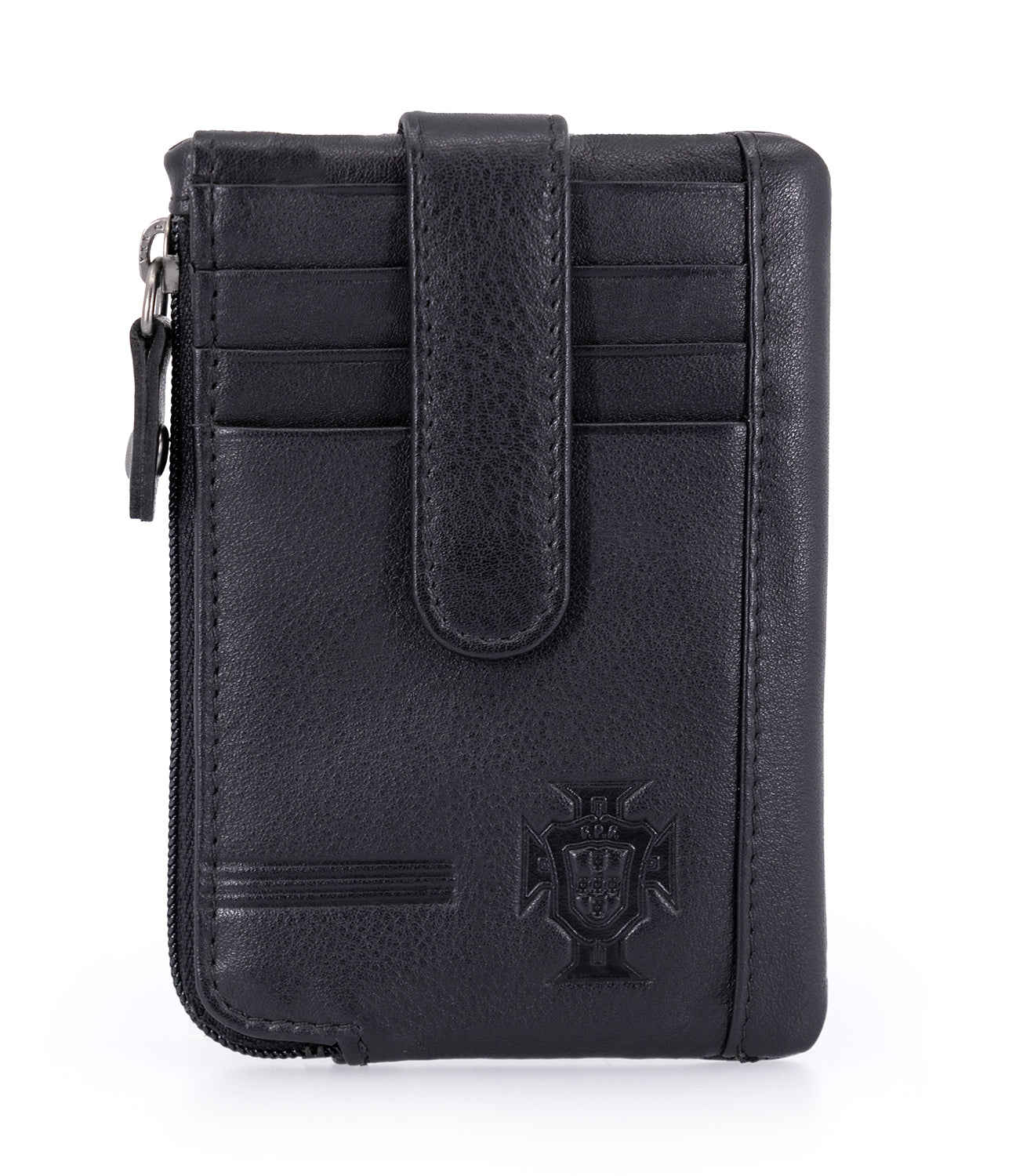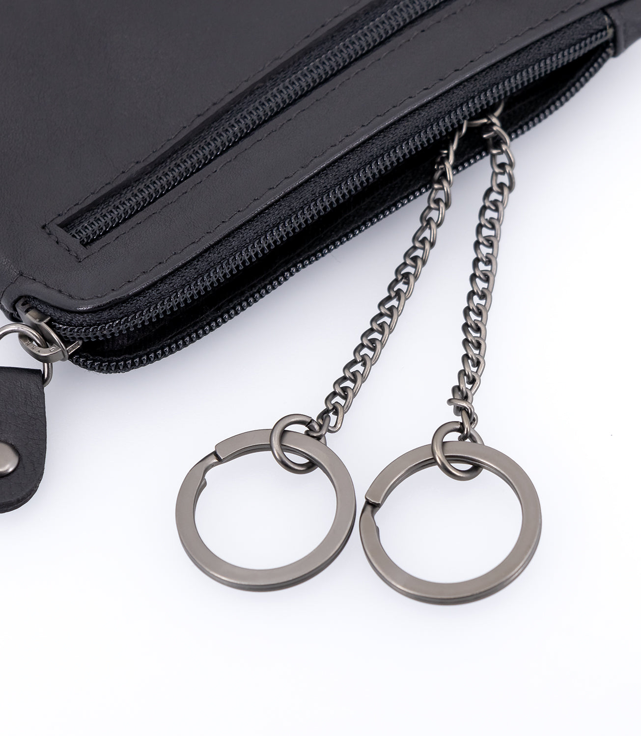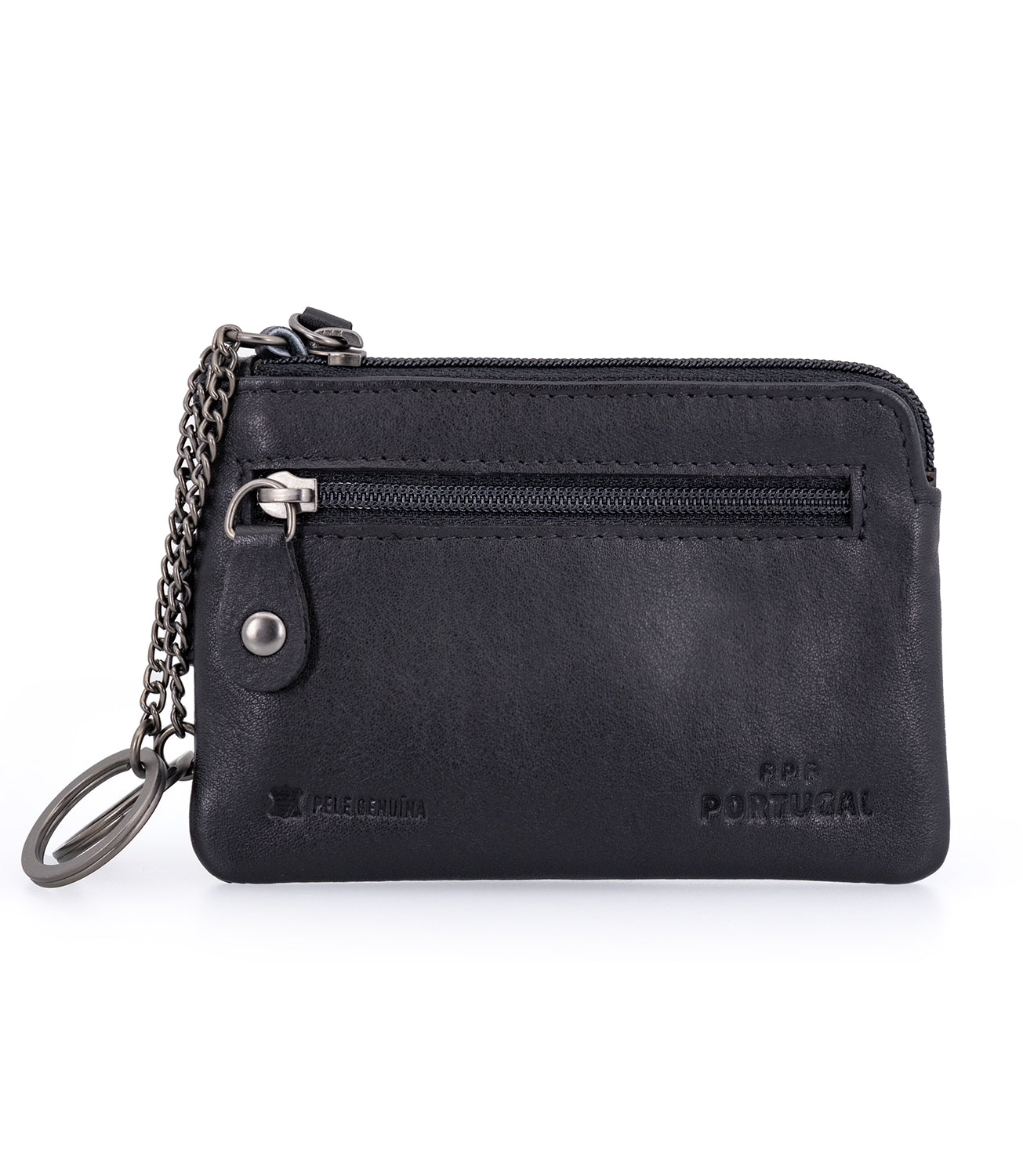 Porta-moedas com fecho de correr. Corrente com argola porta-chaves no interior. Pequeno bolso de fecho atrás. Proteção RFID.