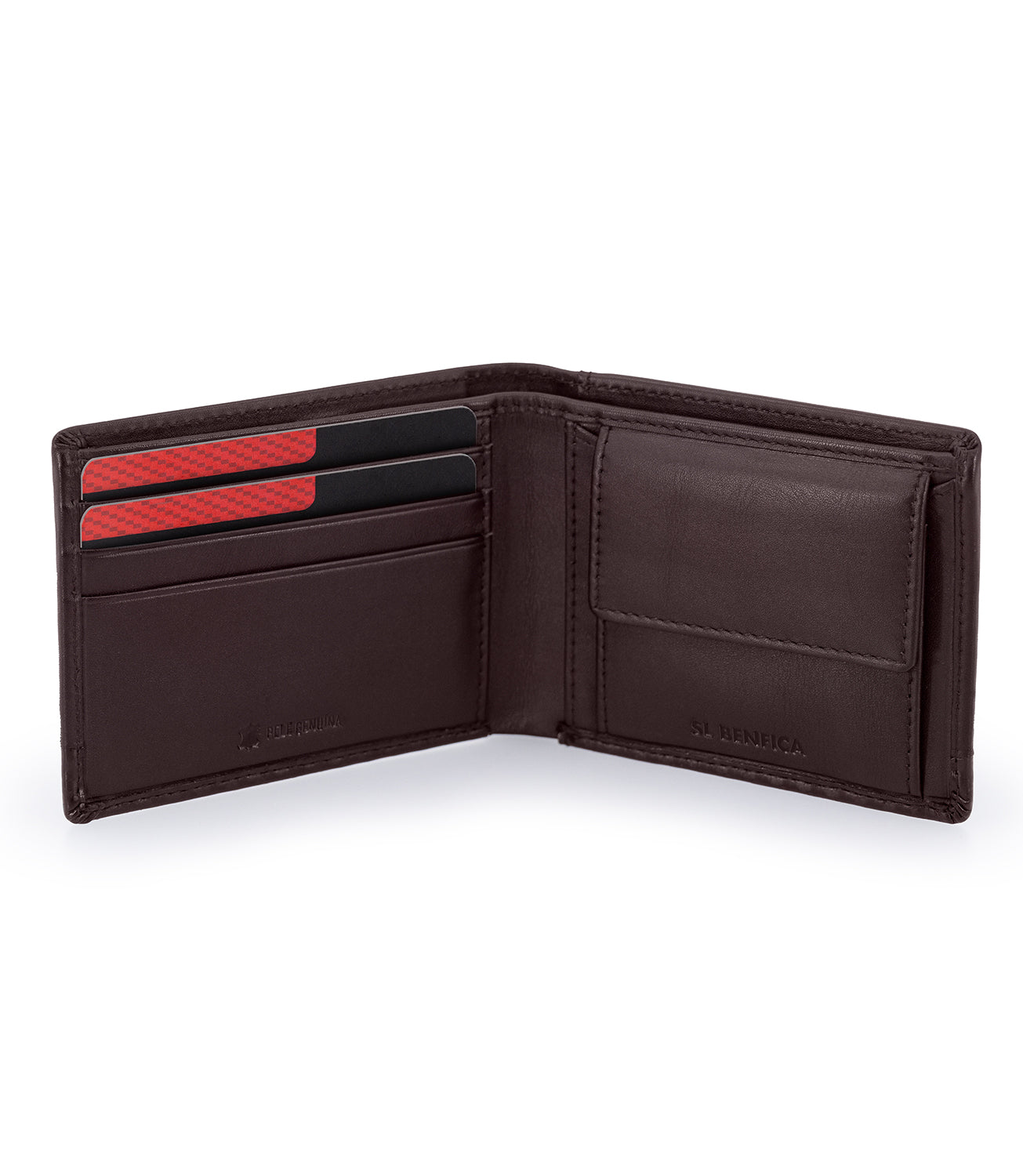 Carteira em pele genuína SL Benfica com logotipo gravado e deatalhes em textura de fibra de carbono.