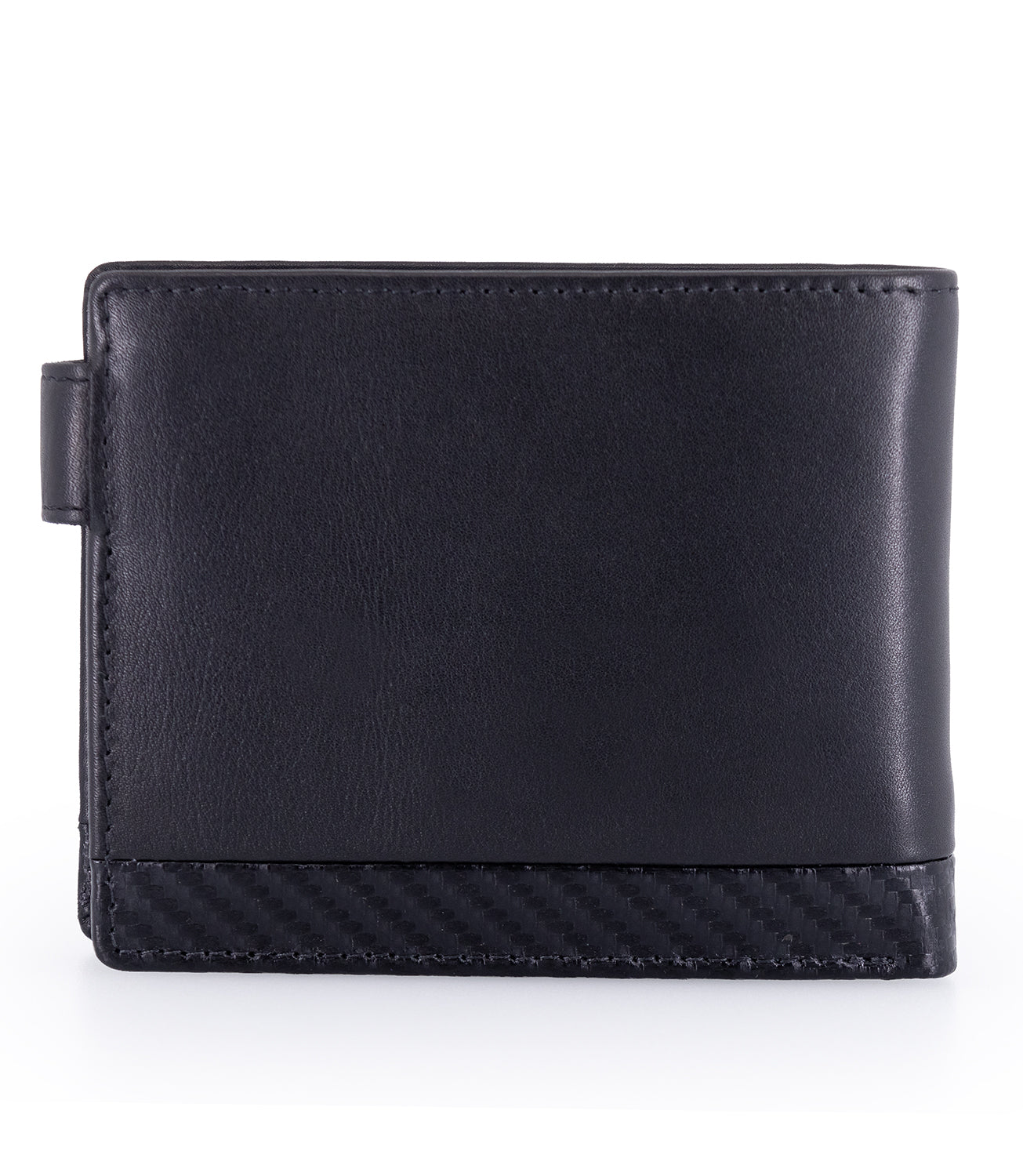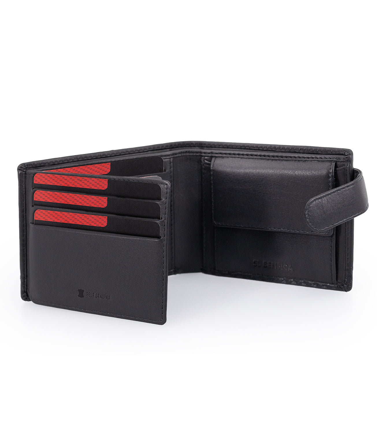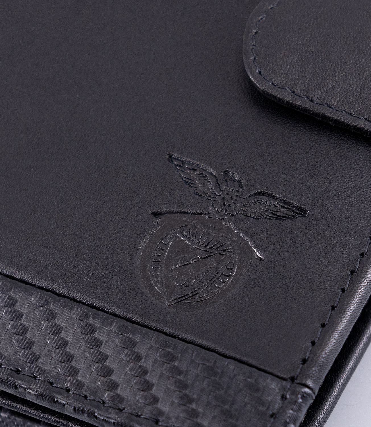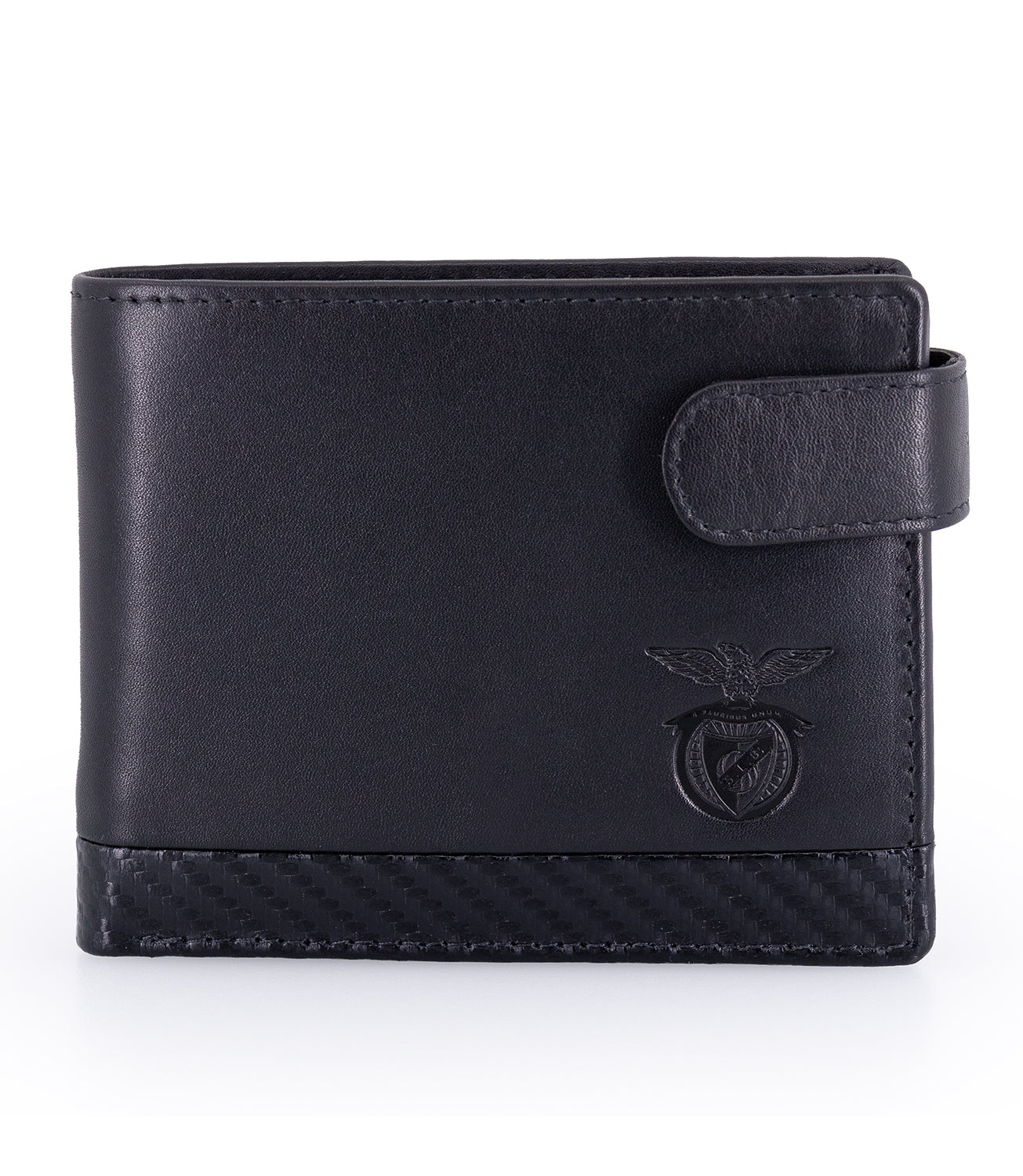 Carteira SL Benfica com presilha. Em pele genuína com detalhes em textura de carbono. Com logótipo gravado.