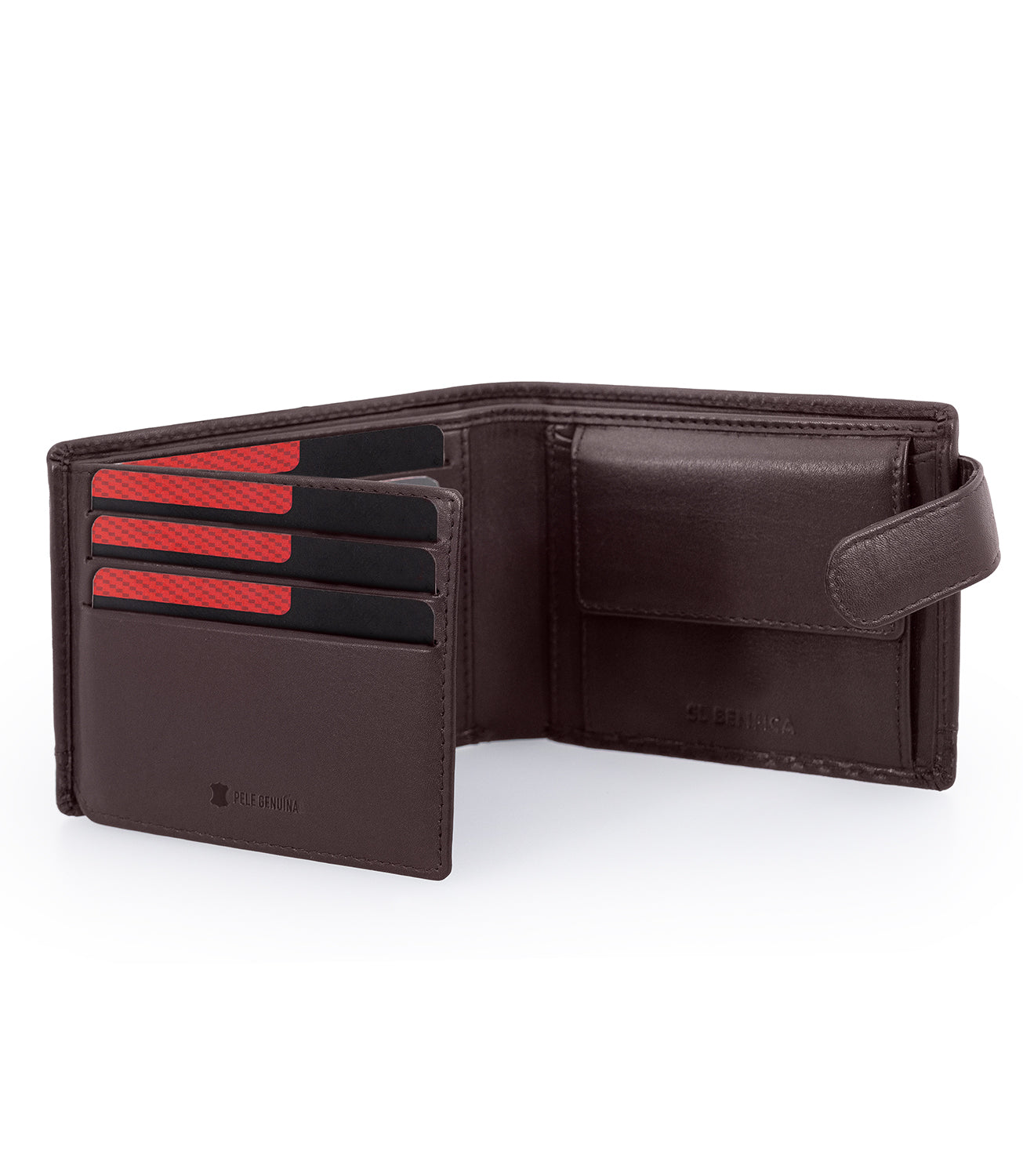 Diversas ranhuras para cartões e uma aba com janela para documentos com foto. Porta-moedas com fecho de mola. Divisória para notas. Proteção RFID.