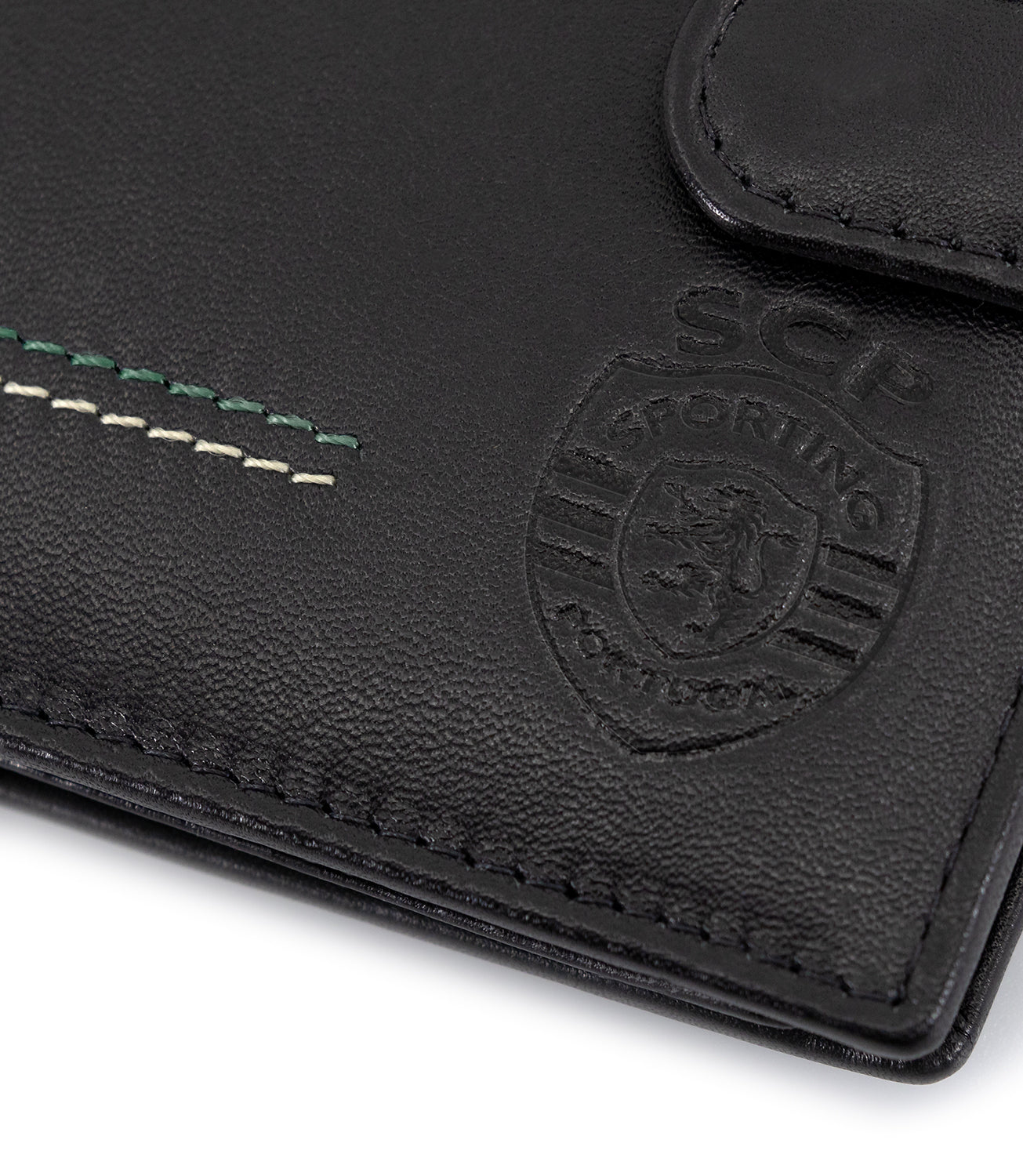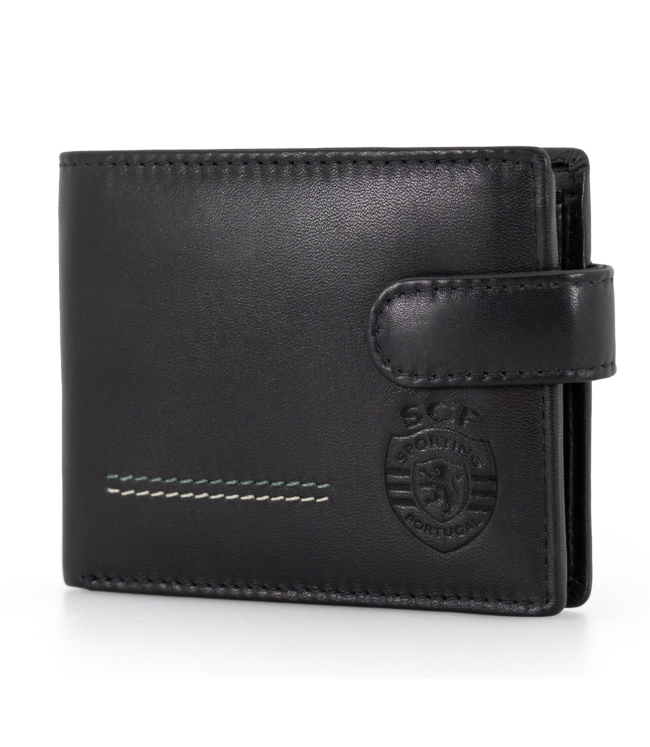 Carteira Sporting com presilha. Em pele genuína com detalhe de pespontos verde e branco Com logótipo gravado.