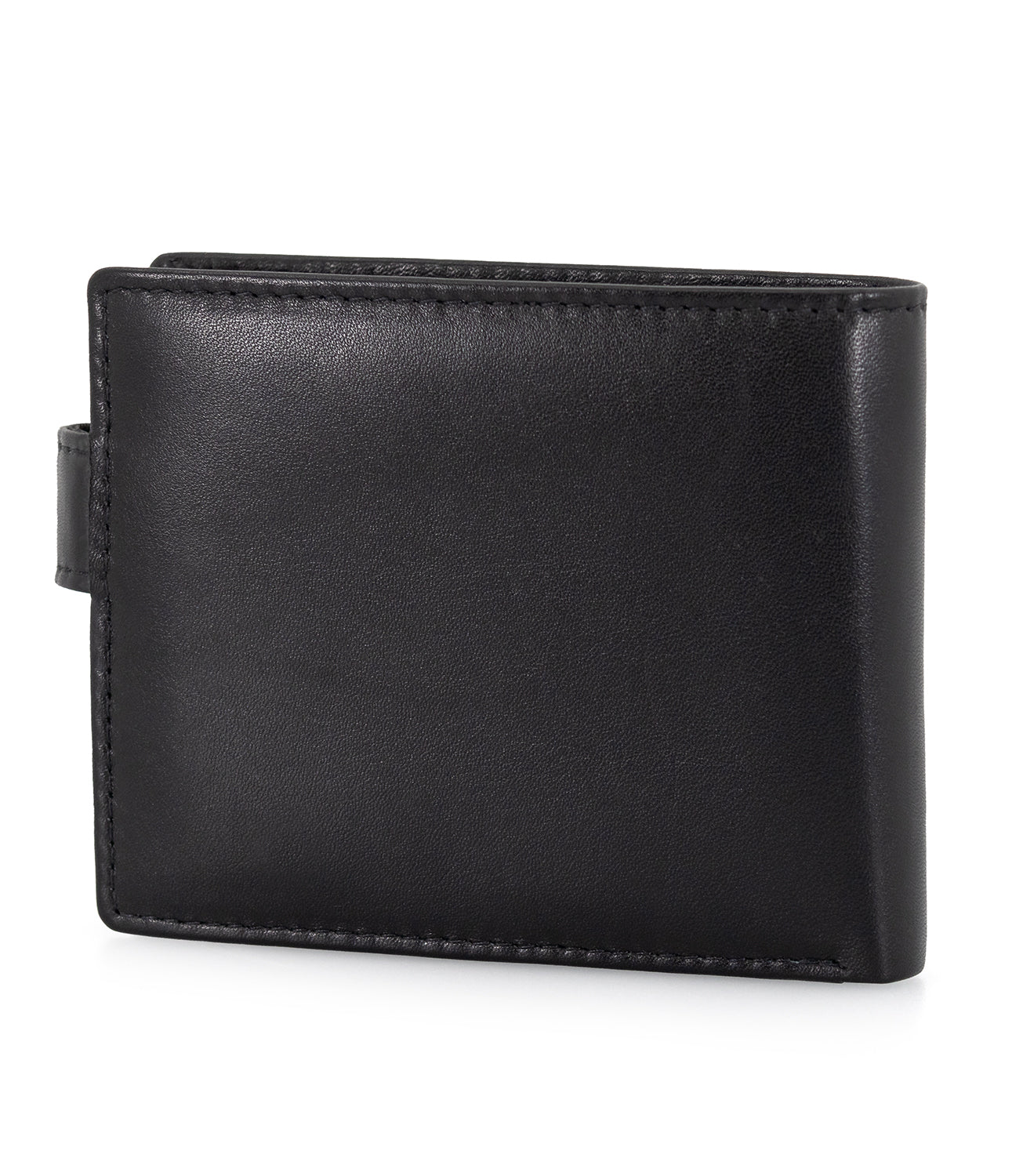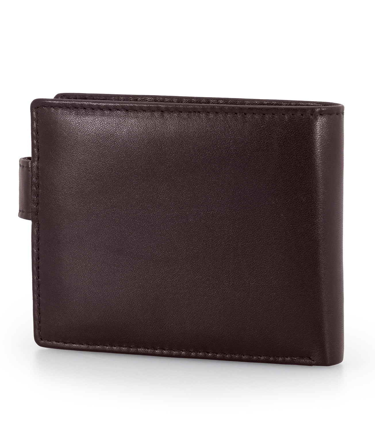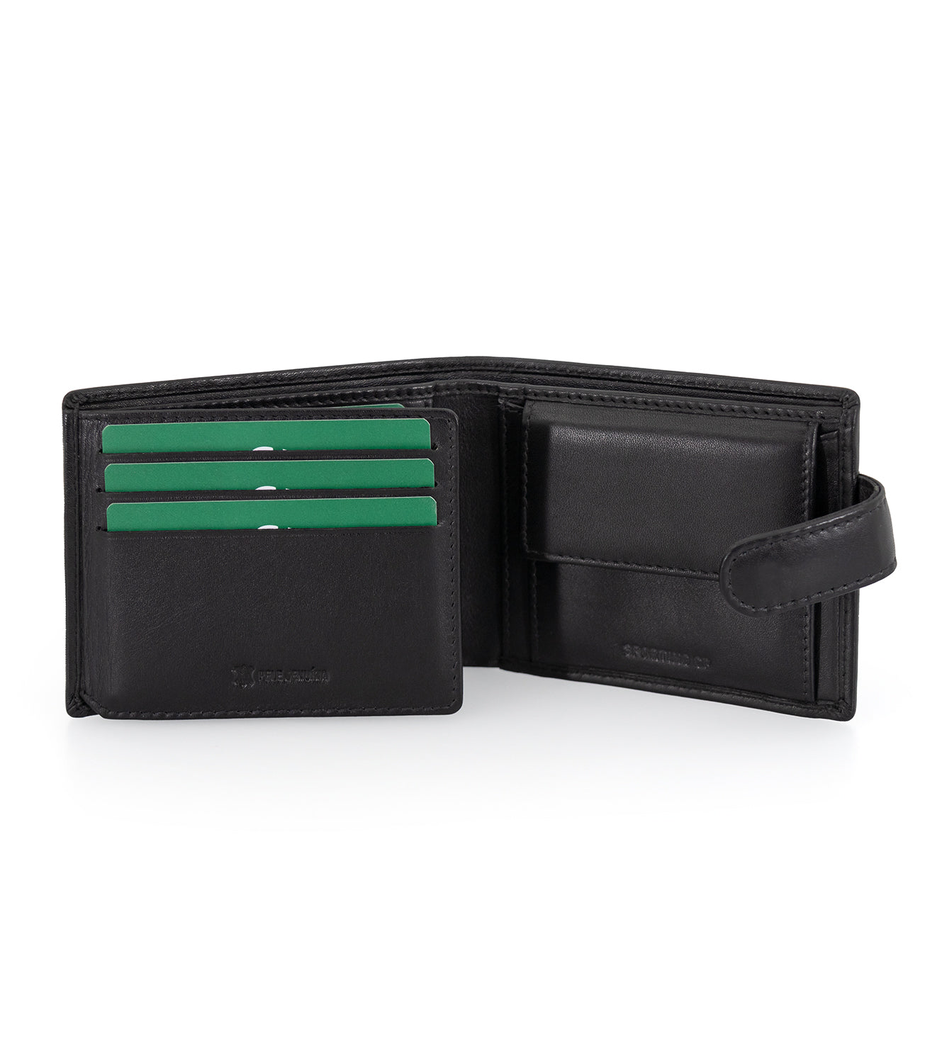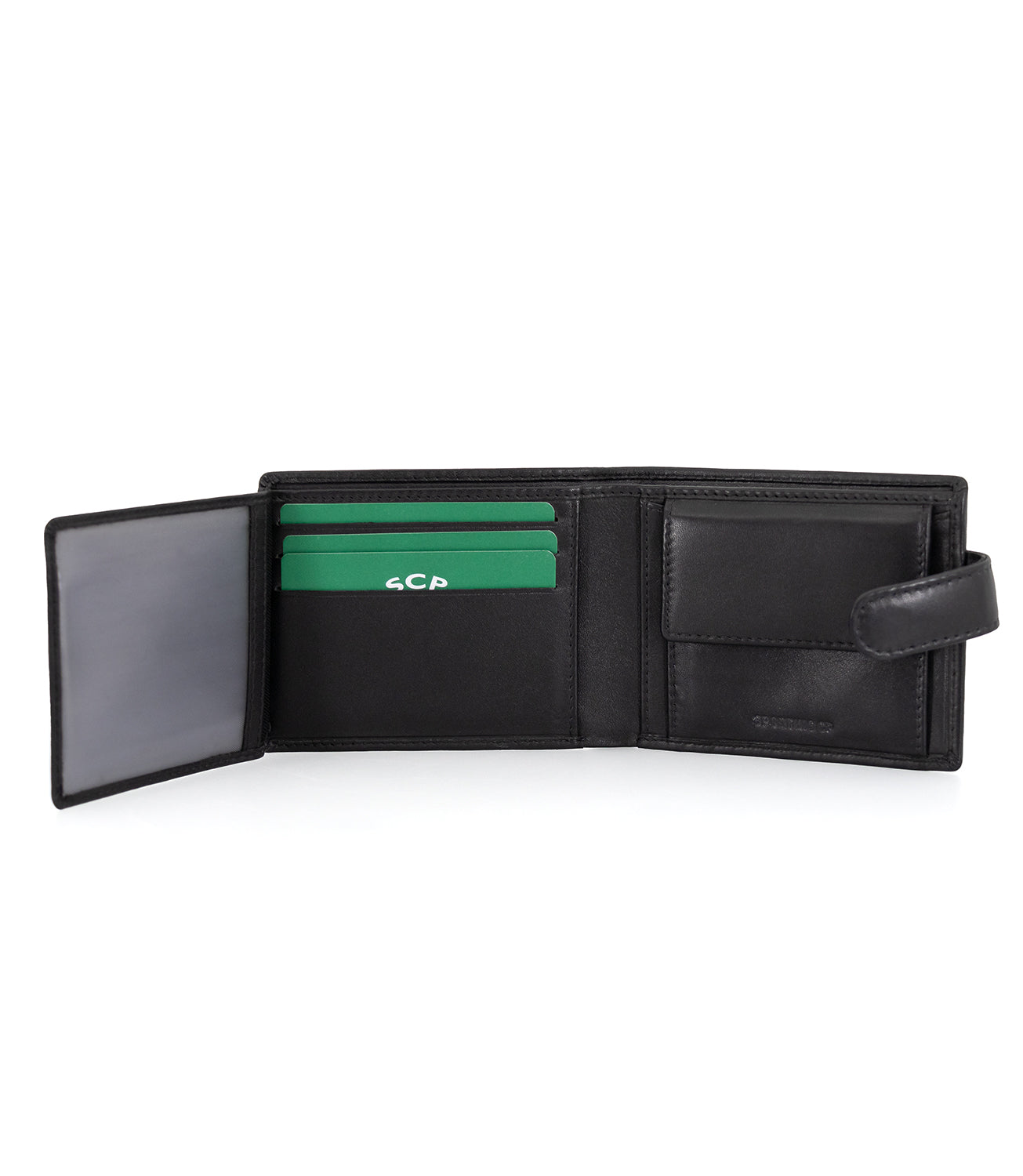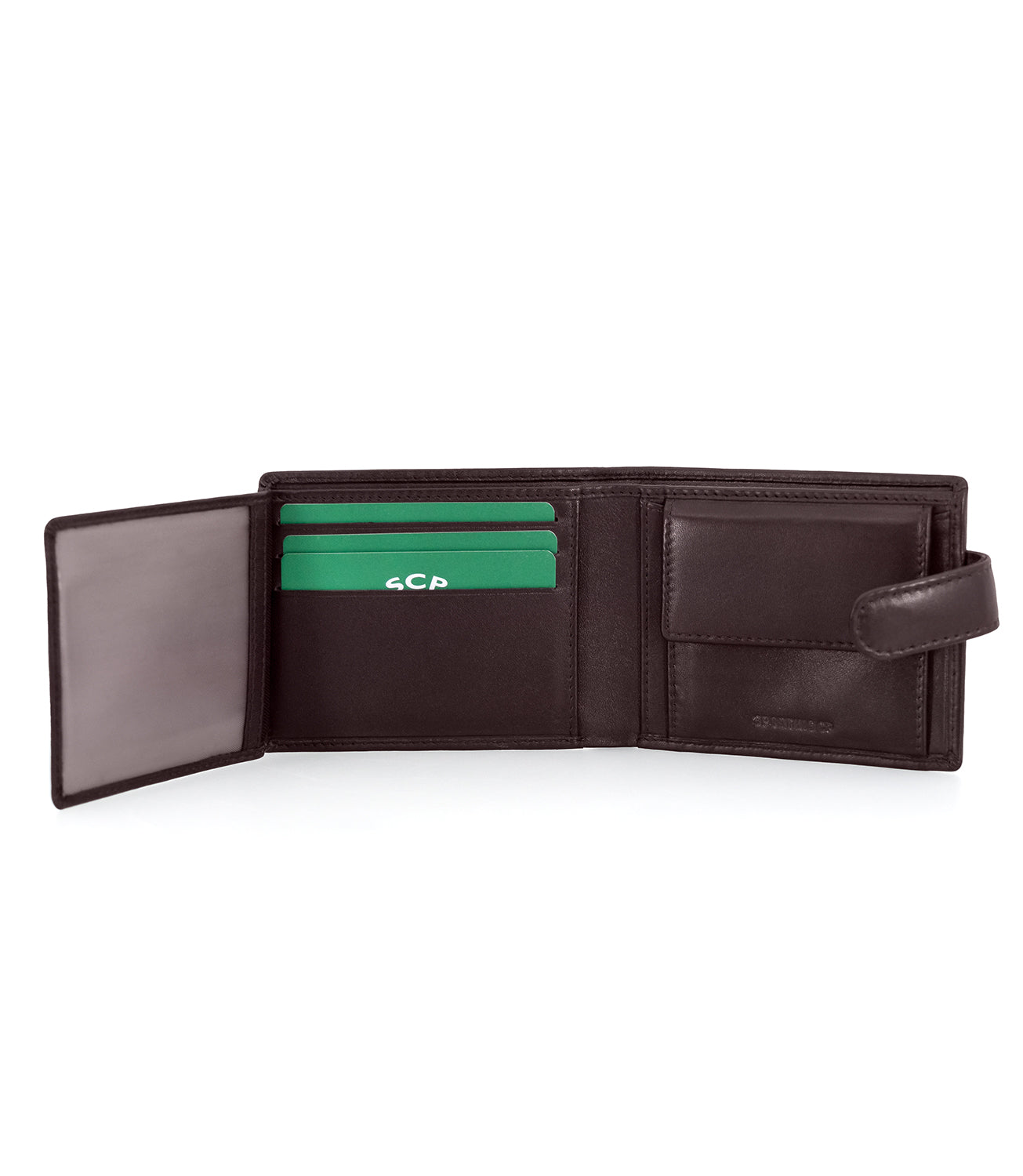 Ranhuras para cartões e uma aba com janela para documentos com foto. Porta-moedas com fecho de mola. Divisória para notas. Proteção RFID.