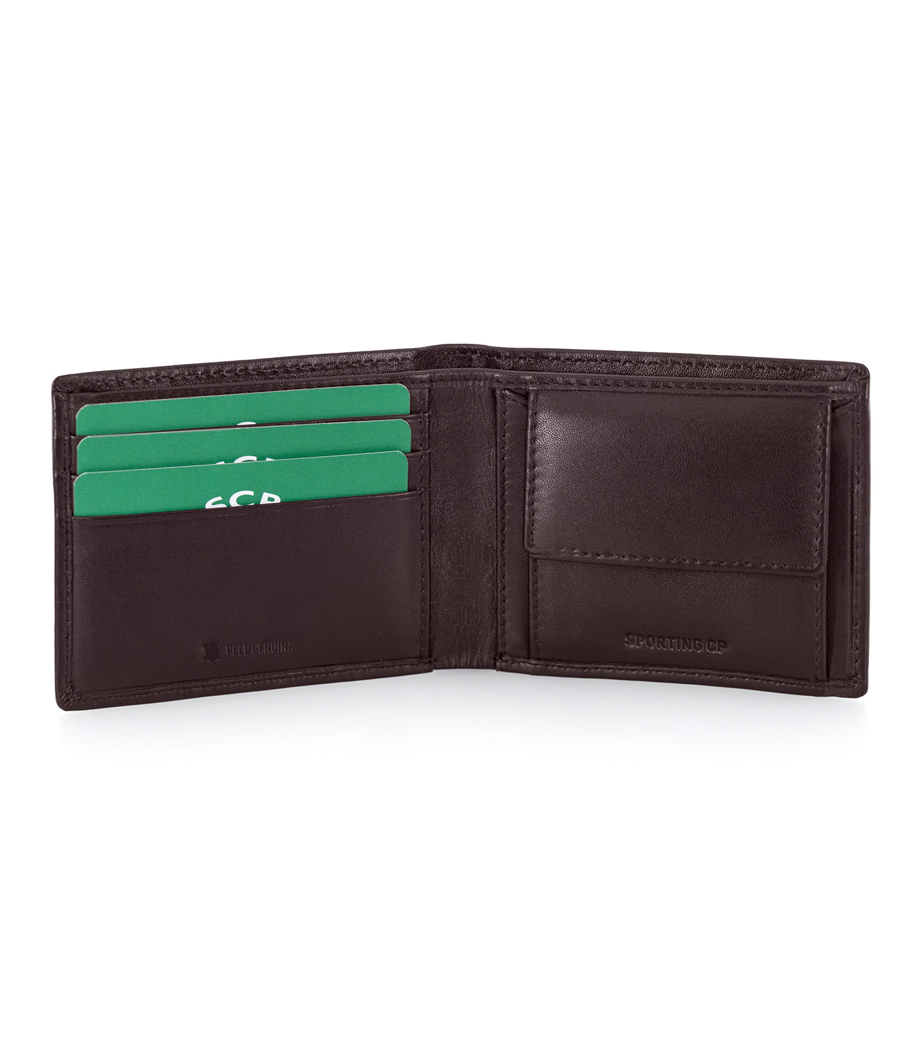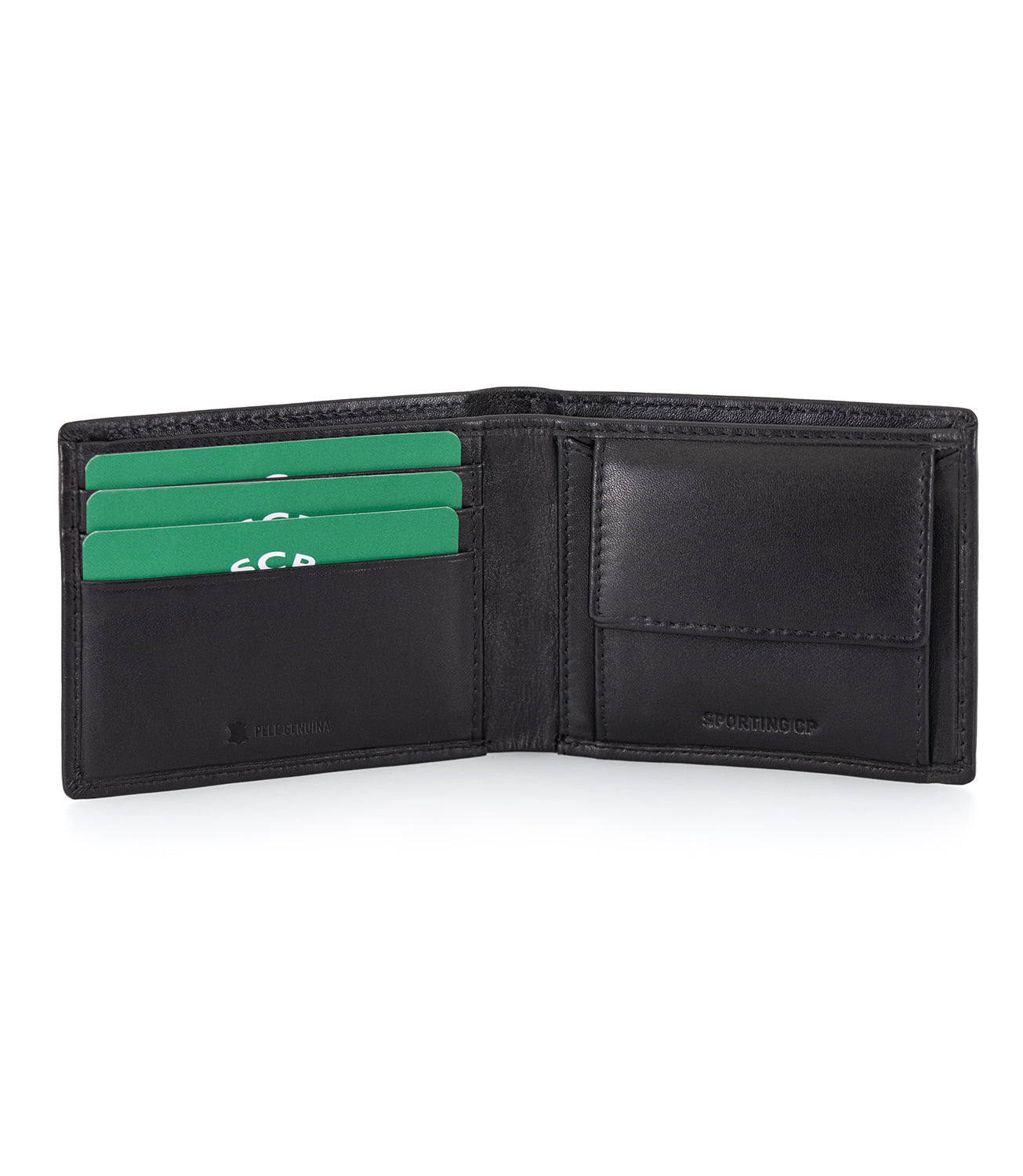 Carteira em pele genuína Sporting CP. Com detalhe em pespontos verde e branco.