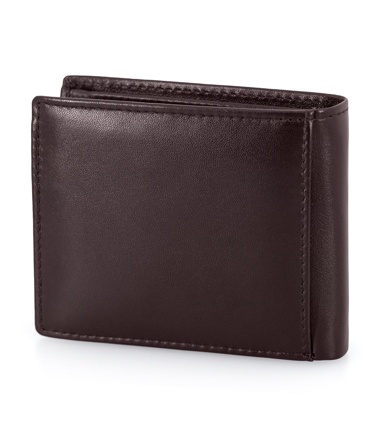 Ranhuras para cartões e uma aba com janela para documento com foto. Porta-moedas com fecho de mola. Divisória para notas. Proteção RFID.