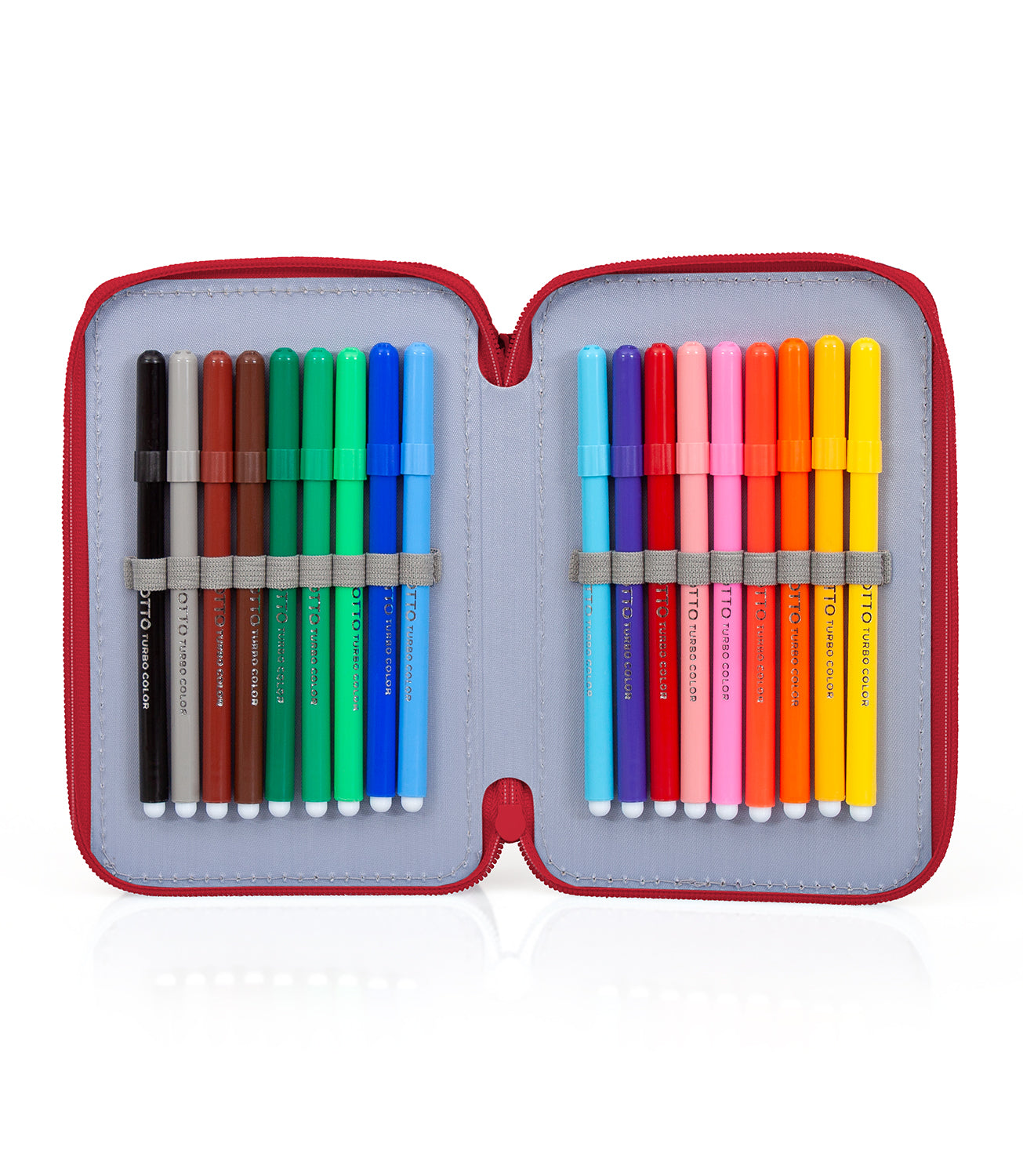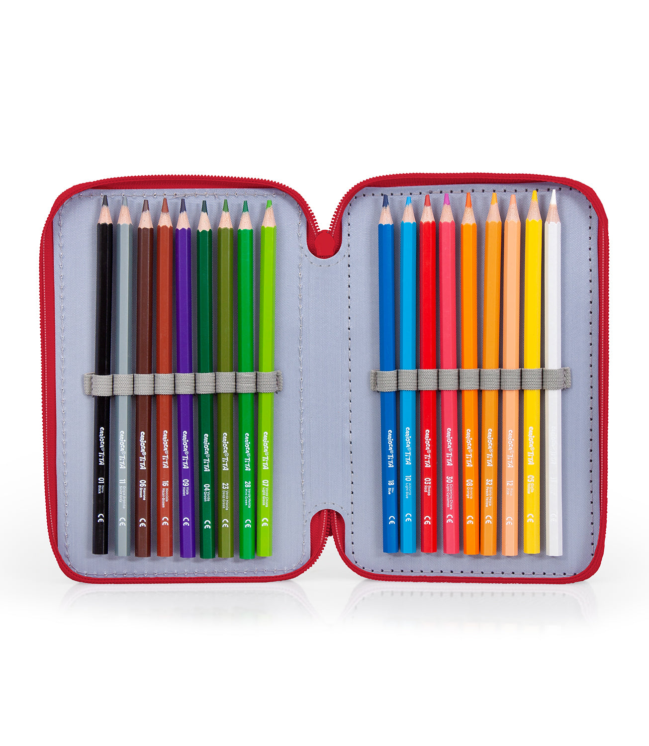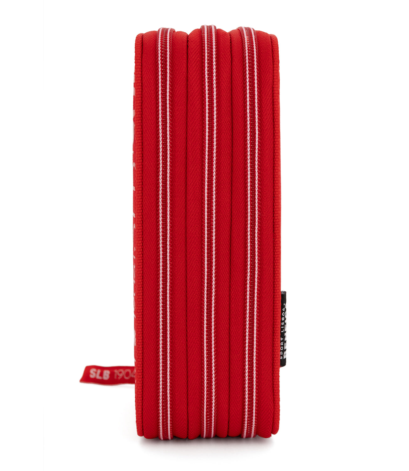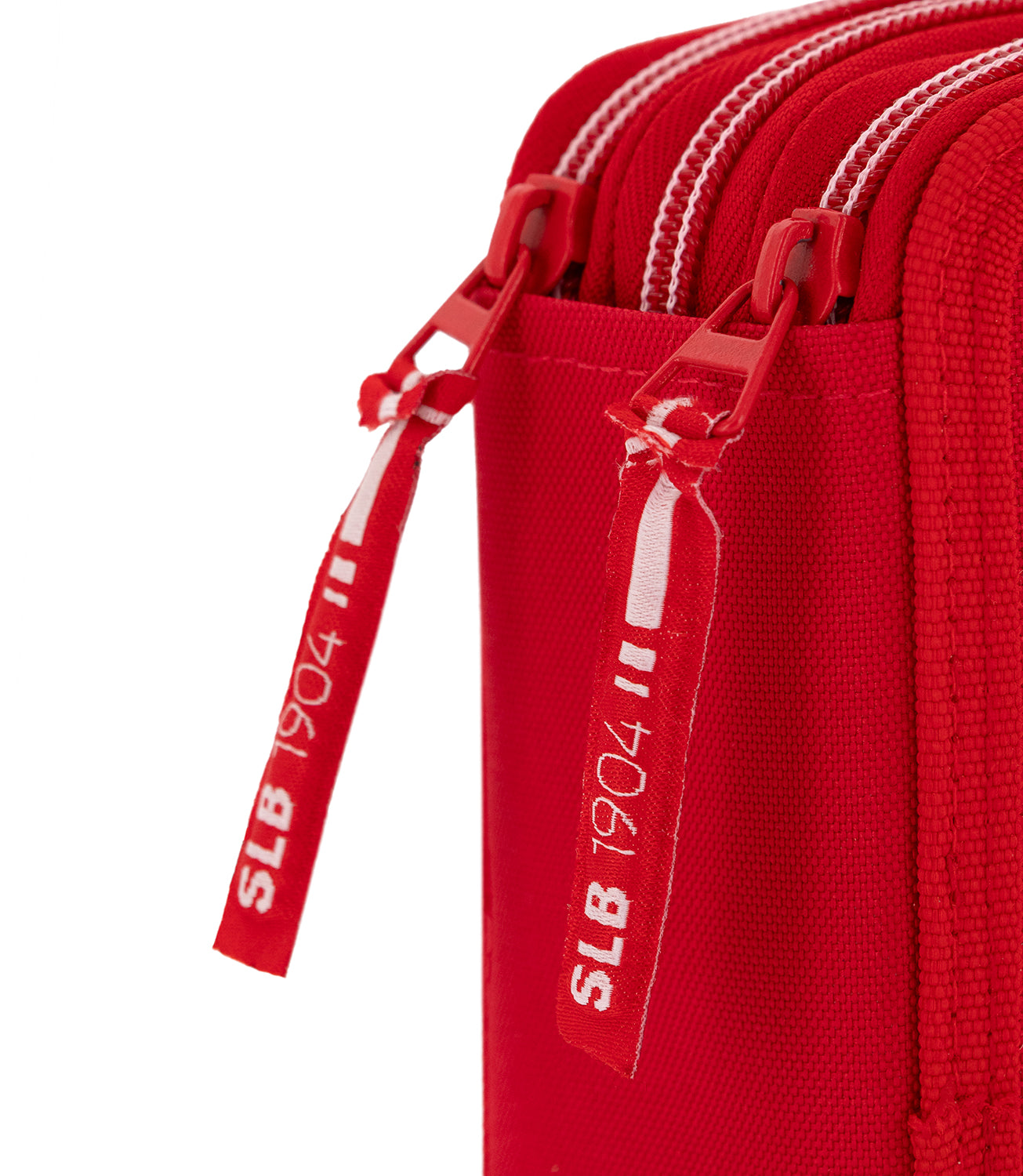 Estojo SL Benfica de 3 fechos, com material escolar e de desenho. Fabricado em poliéster vermelho resistente com interior rígido, forrado. Organizado em três tabuleiros: