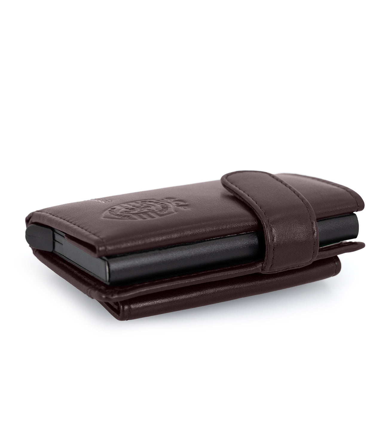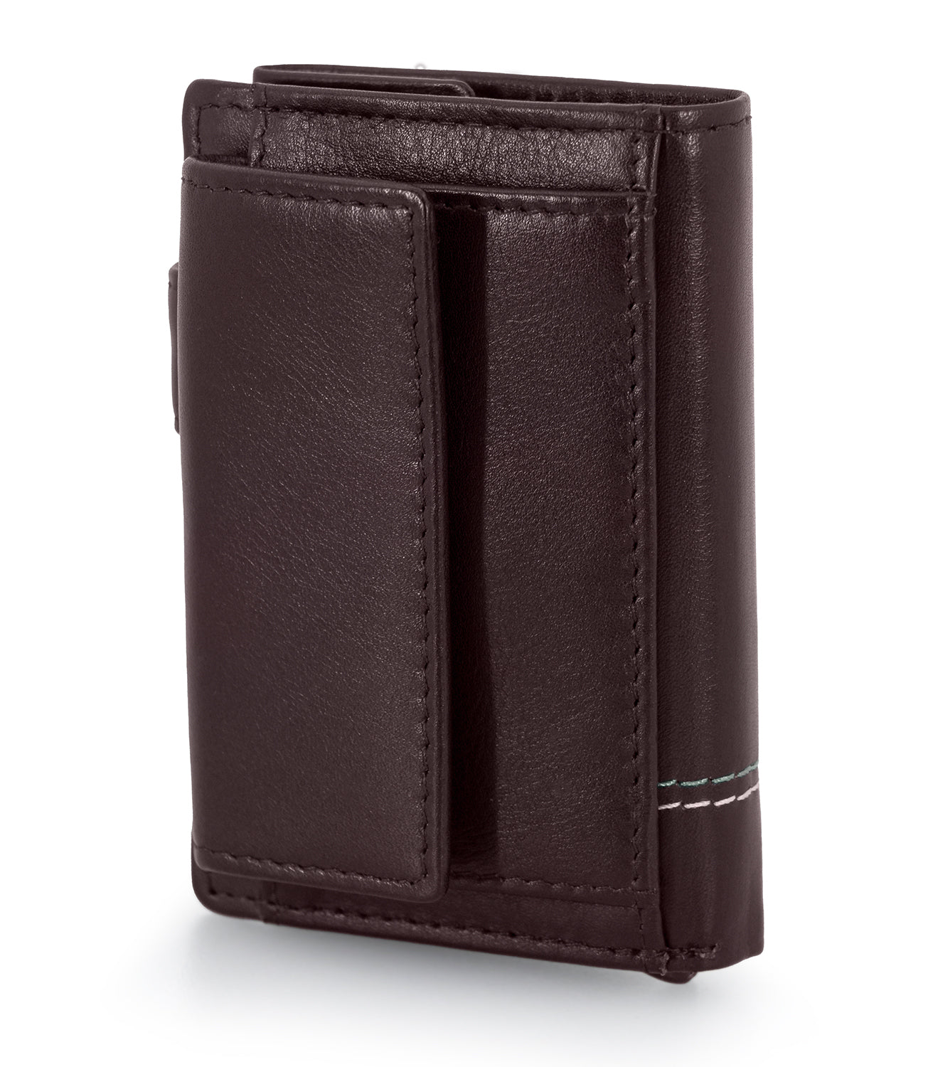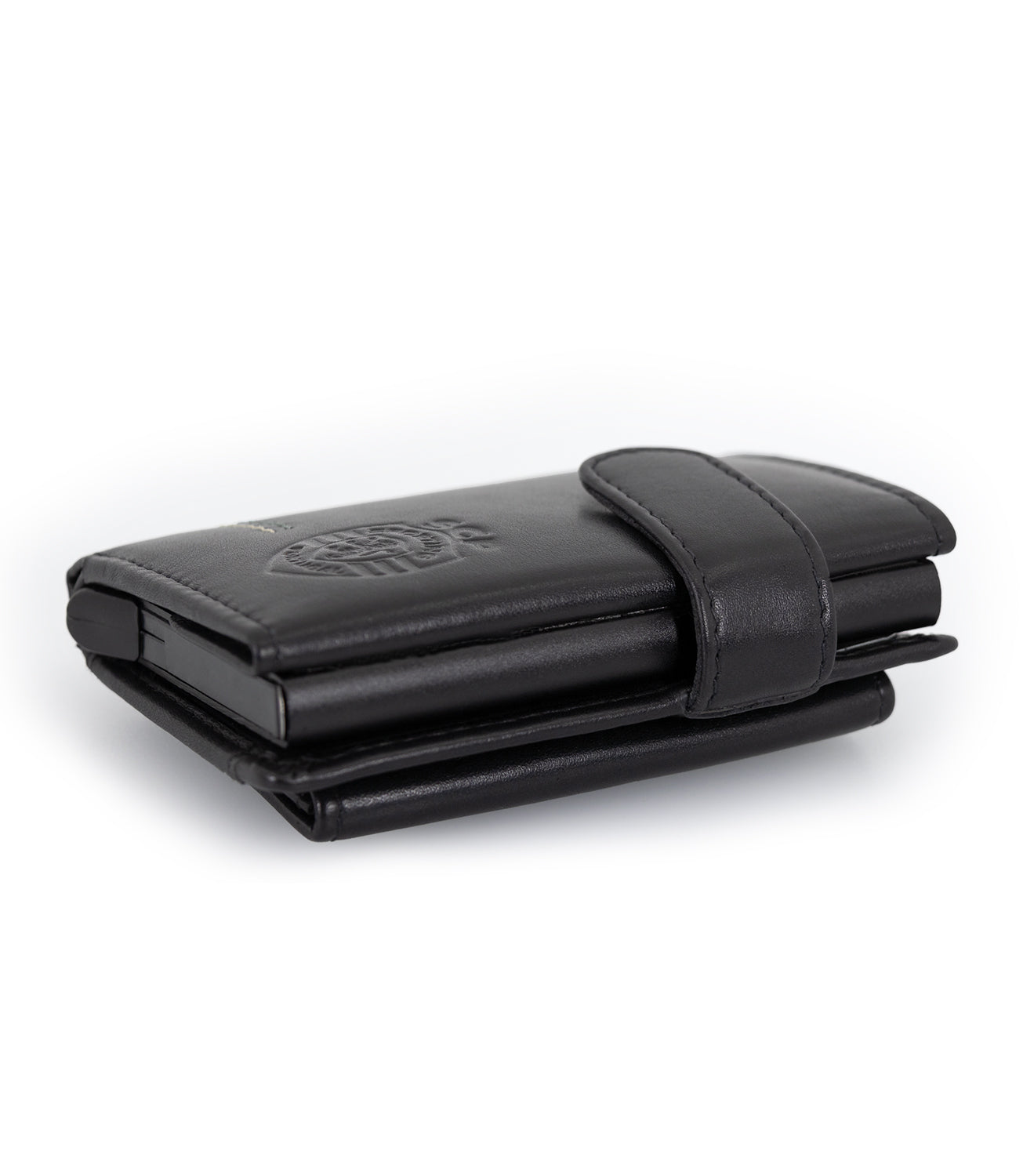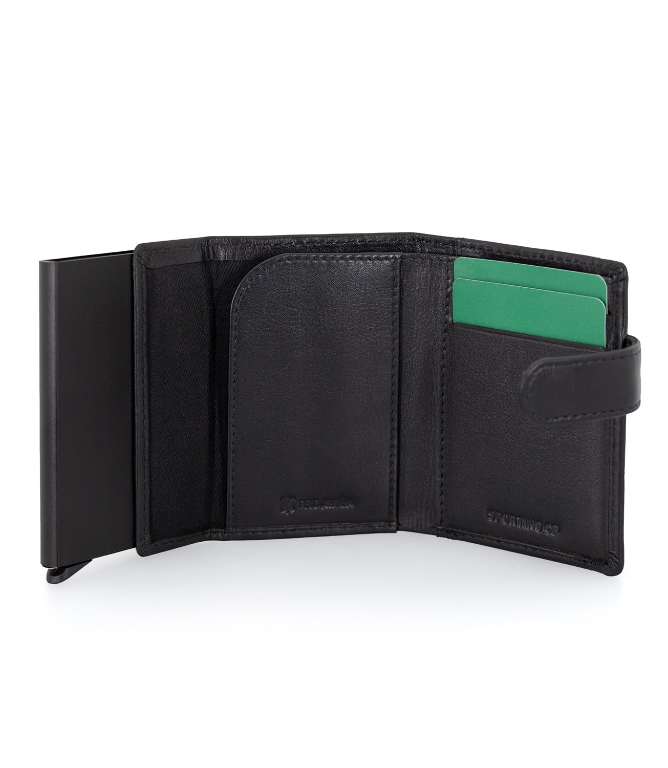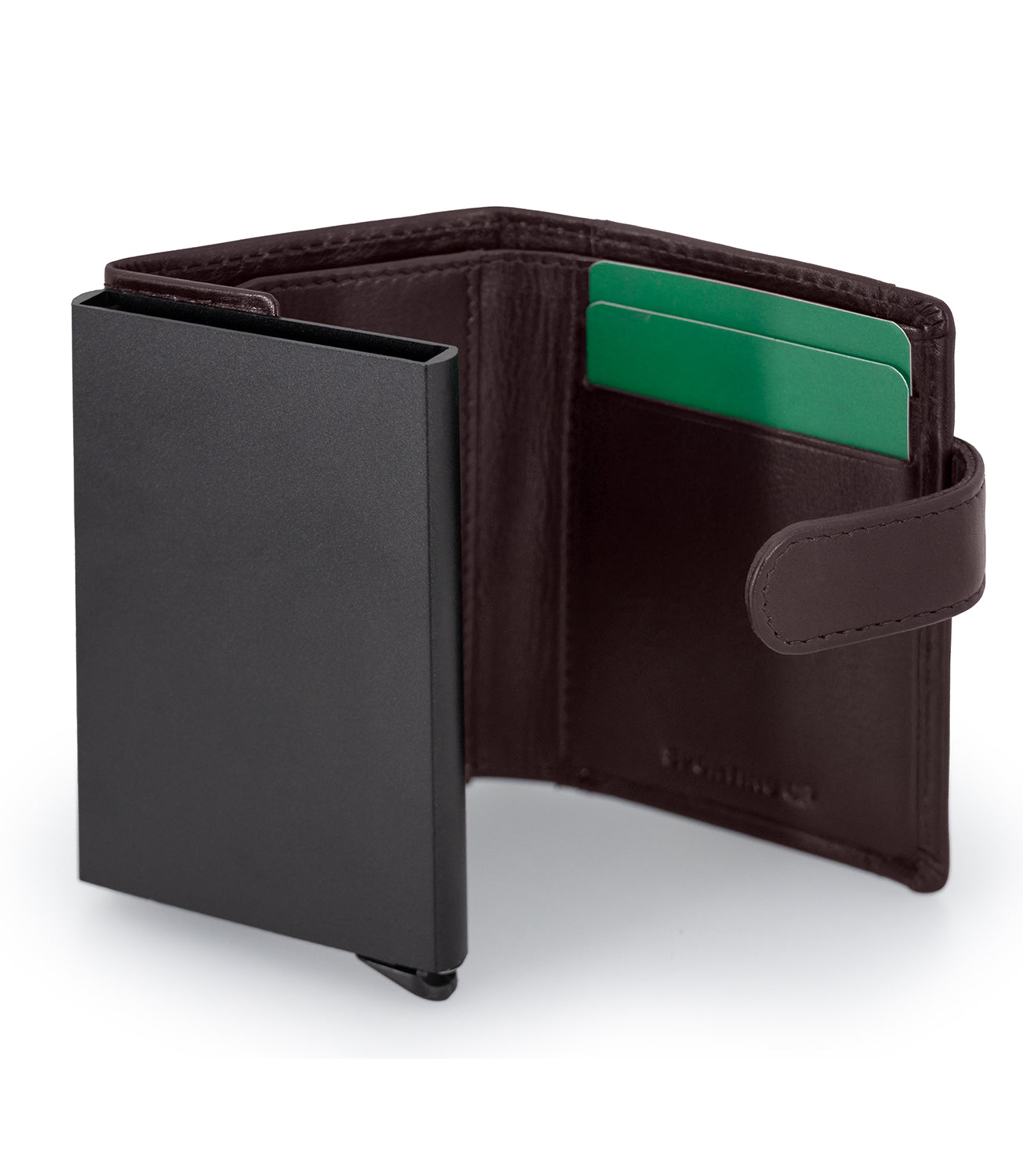 Com ranhuras para cartões e porta-cartões ejetor de alumínio amovível. Proteção RDIF. Divisória para notas.