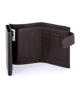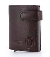 Porta-cartões ejetor em pele genuína com presilha. Logotipo gravado.